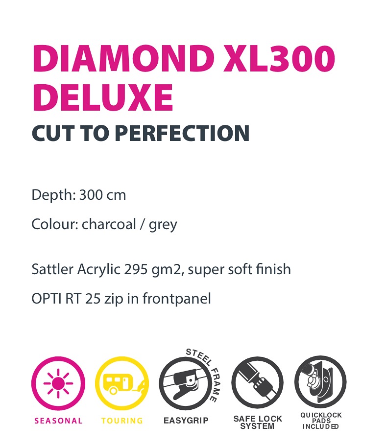 Dorema Diamond XL 300 Deluxe Caravan Awning From £2,029.00 Dorema Sizes: [Choose]Size 6 (775-800)Size 7 (800-825) (+£60.00)Size 8 (825-850) (+£130.00)Size 9 (850-875) (+£230.00)Size 10 (875-900) (+£330.00)Size 11 (900-925) (+£390.00)Size 12 (925-950) (+£420.00)Size 13 (950-975) (+£480.00)Size 14 (975-1000) (+£570.00)Size 15 (1000-1025) (+£680.00)Size 16 (1025-1050) (+£730.00)Size 17 (1050-1075) (+£790.00)Size 18 (1075-1100) (+£840.00)Size 19 (1100-1125) (+£900.00)Size 20 (1125-1150) (+£950.00)Size 21 (1150-1175) (+£1000.00)Size 22 (1175-1200) (+£1050.00) Safe Lock System Kit: [Choose]NOYes (+£45.00) Dorema Annexes Options: [None]Annex De Luxe (+£699.00)Annex de luxe with Innertent (+£859.00)No Thanks Quantity: at £2,029.00 each