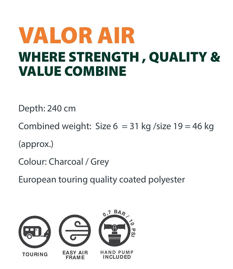 Starcamp Valour Full Air Awning Starcamp Valour Full Air Awning Starcamp Valour Full Air Awning Starcamp Valour Full Air Awning From £939.00 Dorema Sizes: [Choose]Size 6 (775-800)Size 7 (800-825) (+£30.00)Size 8 (825-850) (+£50.00)Size 9 (850-875) (+£100.00)Size 10 (875-900) (+£210.00)Size 11 (900-925) (+£260.00)Size 12 (925-950) (+£330.00)Size 13 (950-975) (+£380.00)Size 14 (975-1000) (+£440.00)Size 15 (1000-1025) (+£530.00)Size 16 (1025-1050) (+£580.00)Size 17 (1050-1075) (+£620.00)Size 18 (1075-1100) (+£680.00)Size 19 (1100-1125) (+£750.00) Safe Lock System Kit: [Choose]NOYes (+£55.00) Annexe Options: [Choose]No ThanksStandard Annex (+£369.00)Standard Annex + Inner tent (+£498.00)2 annexes and innertents (+£996.00) Electric pump: [Choose]No thanksYes Please (+£149.00) Quantity: at £939.00 each